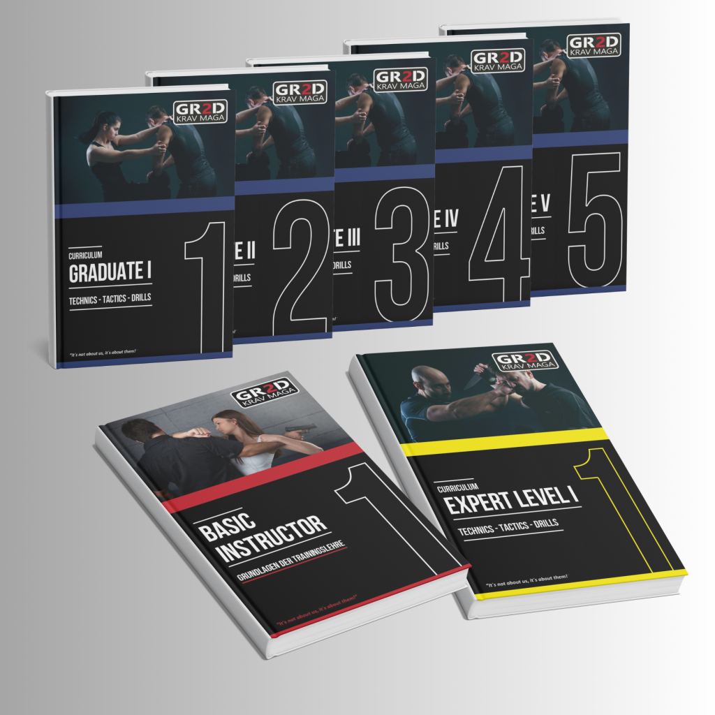 Unsere GR2D© KRAV MAGA Trainerunterlagen bestehen aus insgesamt 7 Handbüchern. Auf mehr als 600 Seiten findest Du alle Techniken, Taktiken, Methoden und Traningspläne. Der optimale Support für Dein Training.